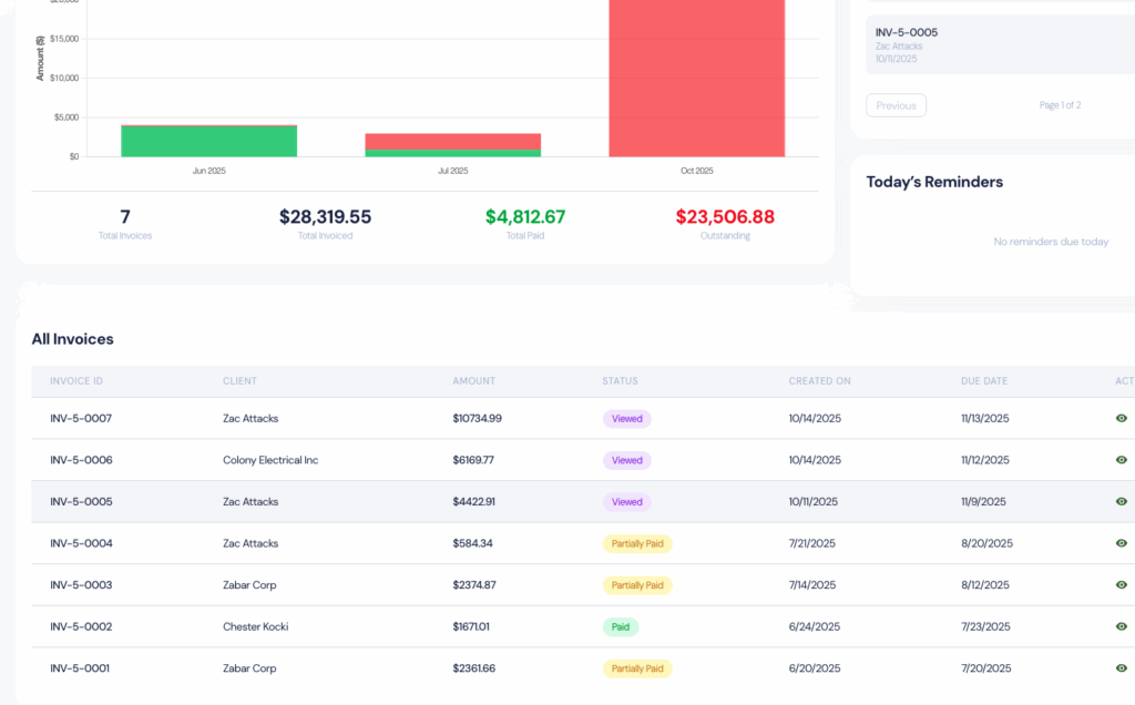 Create, email invoices, records payments, automate billing with overdue processing and reminders.